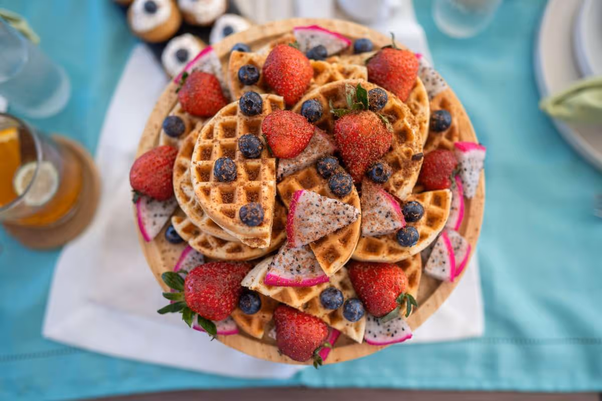 - Waffles, scrambled eggs, bacon, and Brazilian cheese bread with