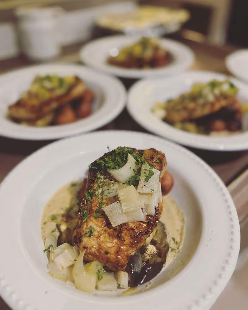 - Chicken au chardonnay sauce with roasted eggplant