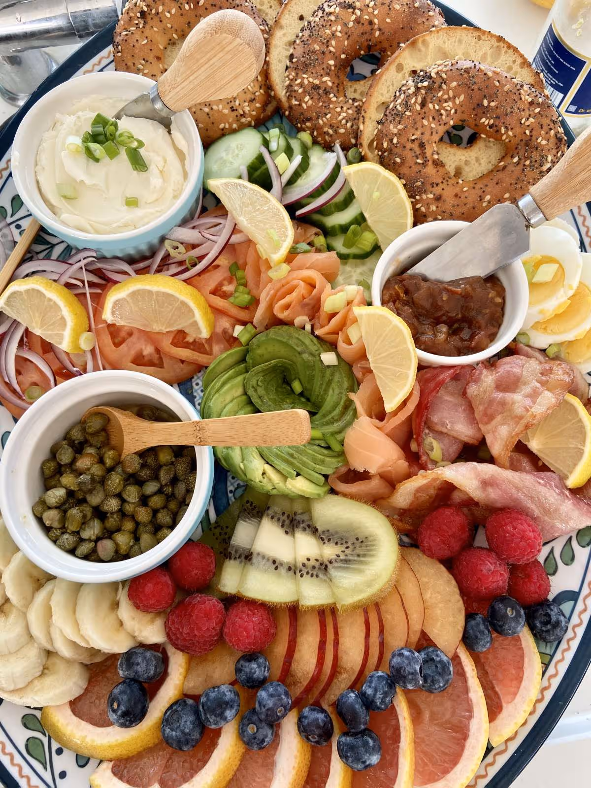 Toasted bagels, smoked salmon, crispy bacon, avocado, egg, cream cheese
