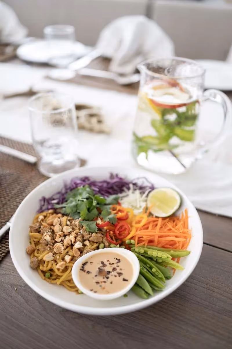 - Spicy Pork Noodle Salad Creamy Peanut Sauce - Shredded Asian Veggies - Crushed Peanuts