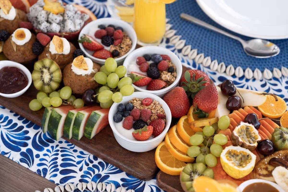 Beautiful cut fruit platter, coffee, tea, fruit juices, yogurts, cereal selection and toast with preserves.