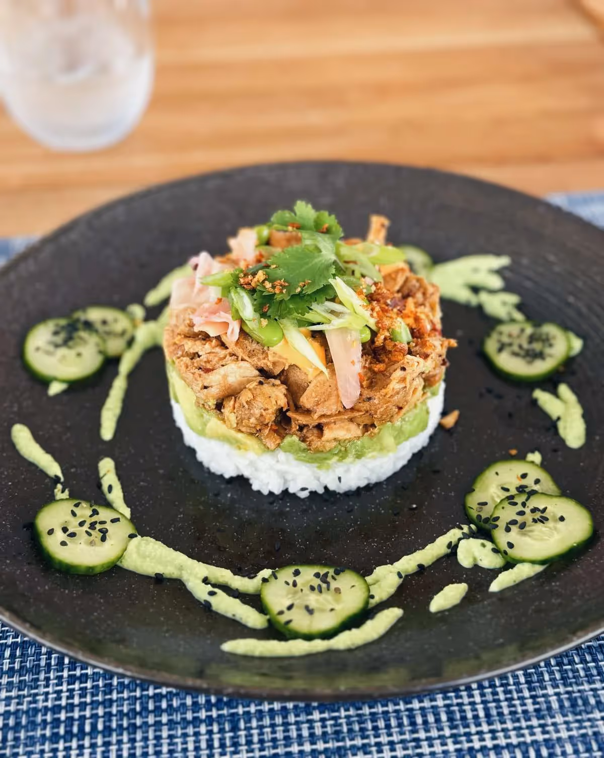 - Tuna Poke Stack - Sticky Rice - Guacamole - Marinated Fresh Tuna - Fresh Veg - Spicy Mayo with Edamame Puree