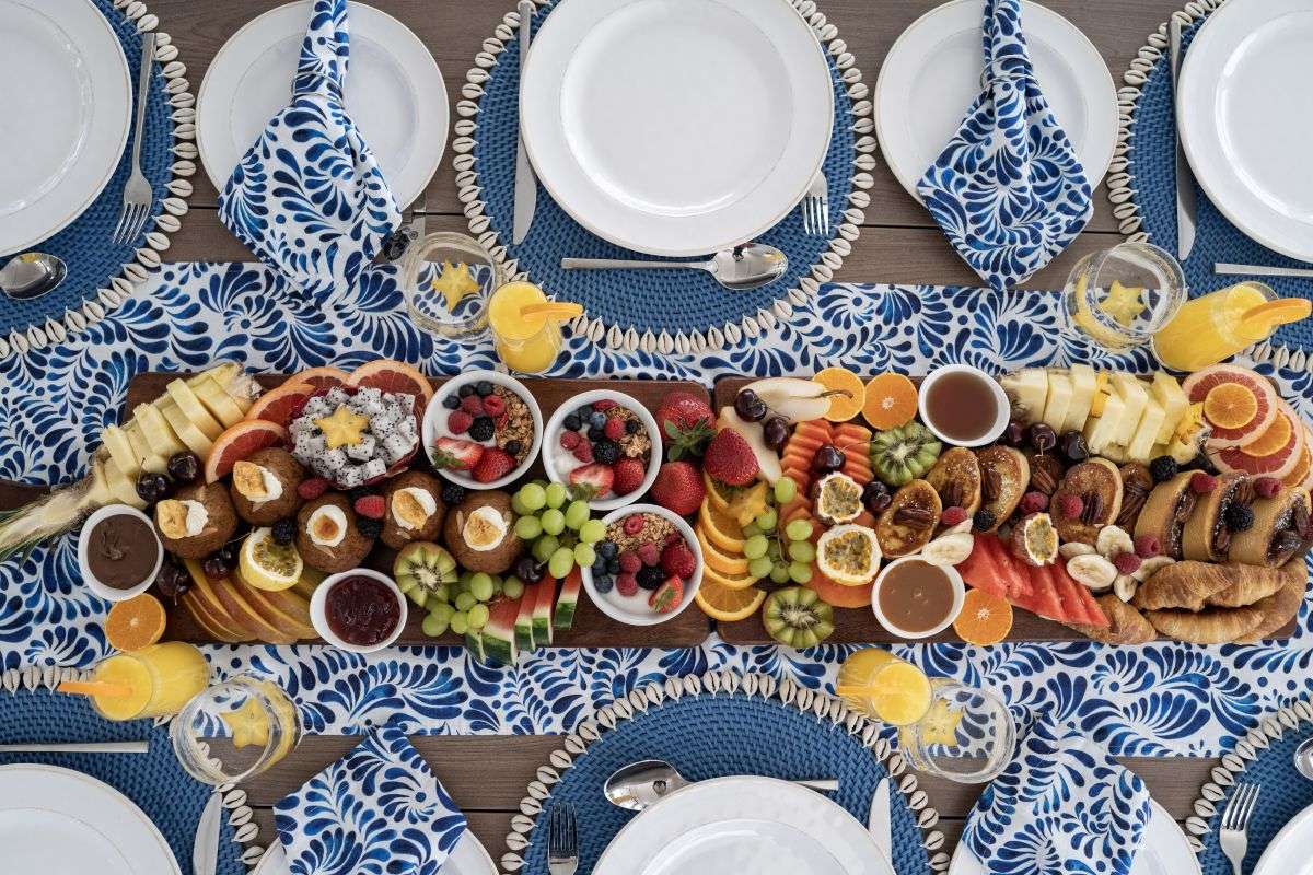 - For the Table: - Freshly brewed coffee, tea selection, chilled fruit juices, yoghurt, and cereal selection. Seasonal local fruit platter with a selection of pastries, toast and preserves.